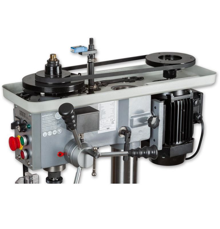 - This impressive floor drill boasts laser point cross hairs and a built-in LED light for precise drilling. The LED speed readout allows you to easily monitor the speed at which you are operating. Additional benefits of this floor drill include a rack and pinion table adjustment for quick and easy adjustments, multi-vee type belts for maximum grip and low vibration, and a foot switch for easy stopping when both hands are in use. The large cast iron table with a polished finish provides a strong and rigid work surface, and the quality 1-16mm keyless chuck allows for quick and easy changing of drill bits.