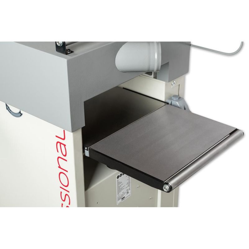 - Designed with busy workshops in mind, the AP410T Thicknesser combines a compact footprint with a robust cast iron table measuring 600 x 408mm. This solid construction provides excellent stability and vibration resistance, ensuring consistent results even under demanding workloads. Front and rear extension tables add vital support for longer workpieces, improving feed stability and helping to minimise snipe at both entry and exit points.