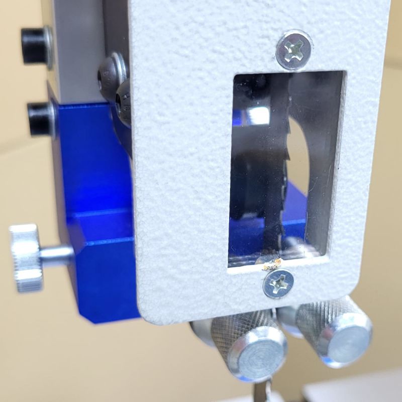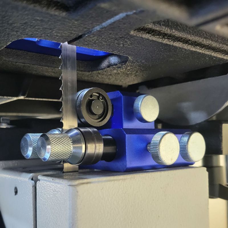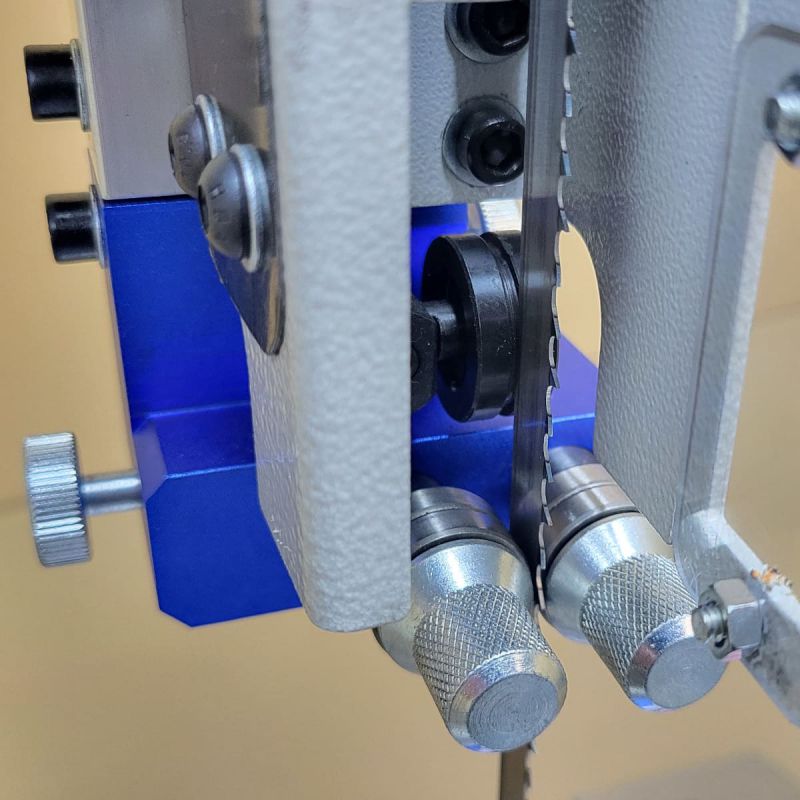 - The blade guide system has 5 sealed bearings at the top and 5 underneath the table. Each side of the blade there are 2 bearings allowing for greater support when using a 20mm blade. The rear bearing has a groove in the centre which allows a 3mm blade to be used for Scroll work. All of the bearings have tool free adjustment making the Cobra bandsaw one of the easiest bandsaws on the market to set up.