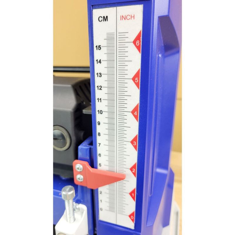 - The thicknessing height is quickly set using a large adjusting handle and reading from a scale, marked in both metric and imperial measurements. This setting can be physically secured using the cutting depth locking handle to ensure repeatability of the cutting depth. The timber is fed through the cutters by two rubber coated drive rollers. The cutter block rotates at 9000rpm leaving a smooth unmarked finish. A cut of up to 3mm deep can be made, when more than 3mm needs to be removed, simply use the quick action depth stop to ensure final dimension is not exceeded. Then make multiple passes to obtain the desired depth.