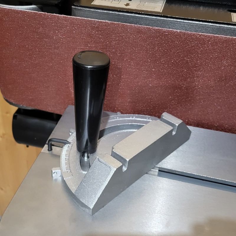 - The belt can be used in the vertical position with the cast iron work table providing a perfect 90 degree finish. The work table is height adjustable, using a hand wheel, to allow the full height of the belt to be used even when working with thin materials. In this way the entire belt is used, lowering running costs. The work table is equipped with an adjustable mitre guide which locks into a T-slot for finishing angled pieces. It can be set at 90 degrees or anywhere in a swing of 120 degrees.