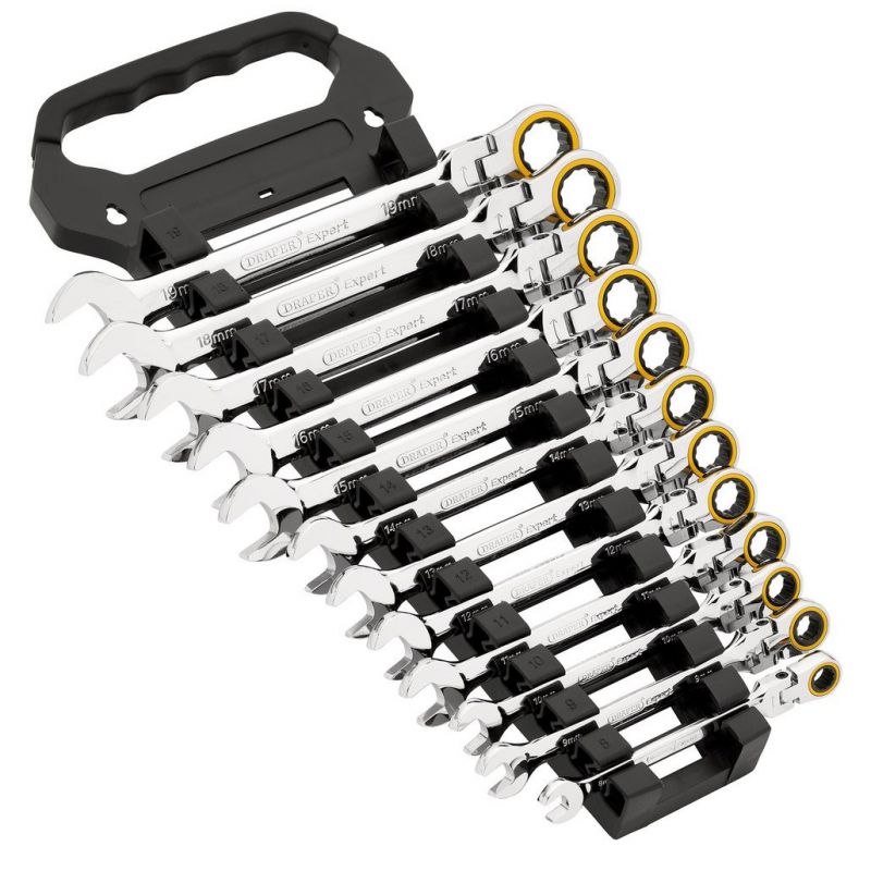 - This 12-piece Draper Expert HI-TORQ® metric flexible head ratchet combination spanner set is manufactured from hardened and tempered chrome vanadium steel, with a mirror chrome plate finish for corrosion protection.