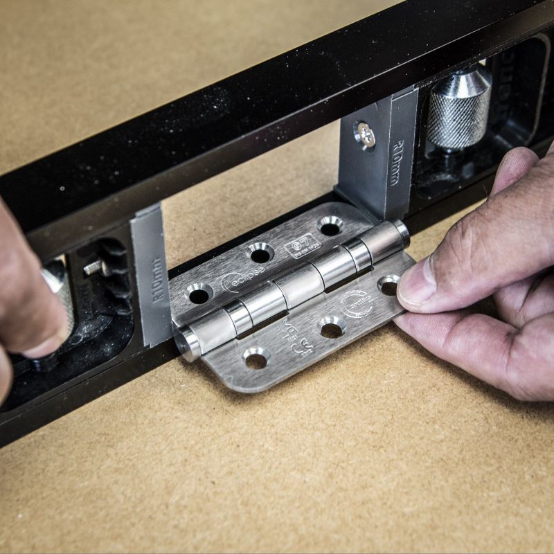 Fully-adjustable, modular routing jig designed to quickly and accurately recess square and 10mm radius hinges in timber doors & frames. Accommodates both full-height (1981mm/2040mm) and custom smaller doors.