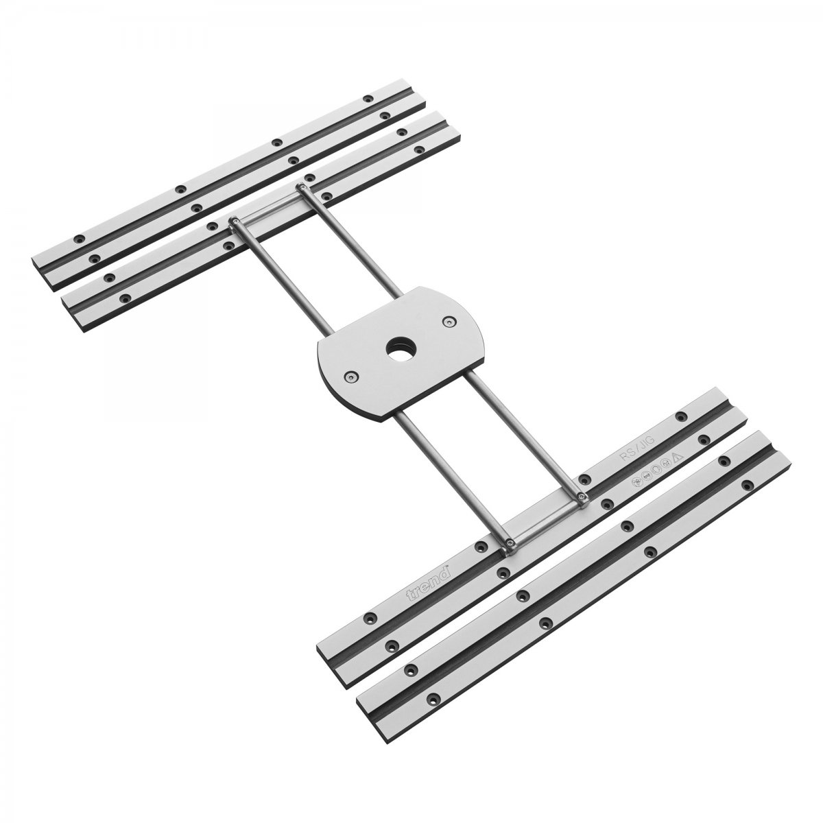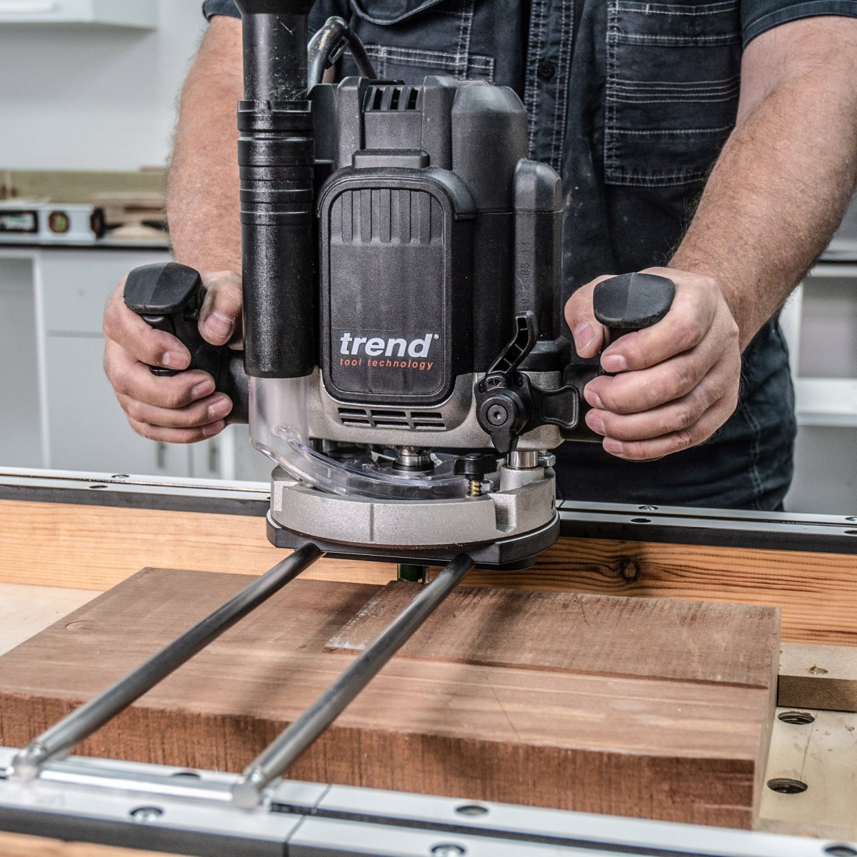 Adaptable router jig for flattening, surfacing and trenching on irregular shaped and wide material up to 400mm wide. Ideal for fine, skimming cuts and deep, levelling cuts.