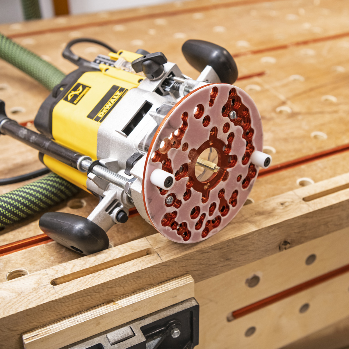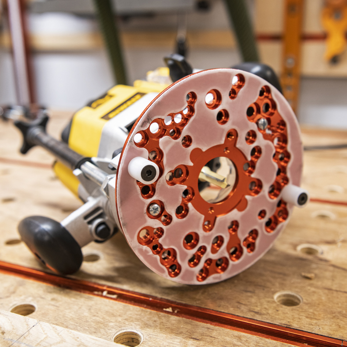 Some routers can be difficult to match up with suitable guide bushes and a universal sub base can be the only solution. A round base can be preferable in many circumstances too. The UJK Sub Base is precision machined from aluminium and fitted with a low friction surface for ease of use. It is designed to accept standard UJK guide bushes and holes for these are drilled with an M4 thread. It is also designed for mounting to a very wide range of different routers including Bosch, Makita, Elu, Dewalt, Festool, Trend, Ryobi and Hitachi models to name a few. 176mm diameter x 7mm thickness. Requires the addition of the fixing kit.
