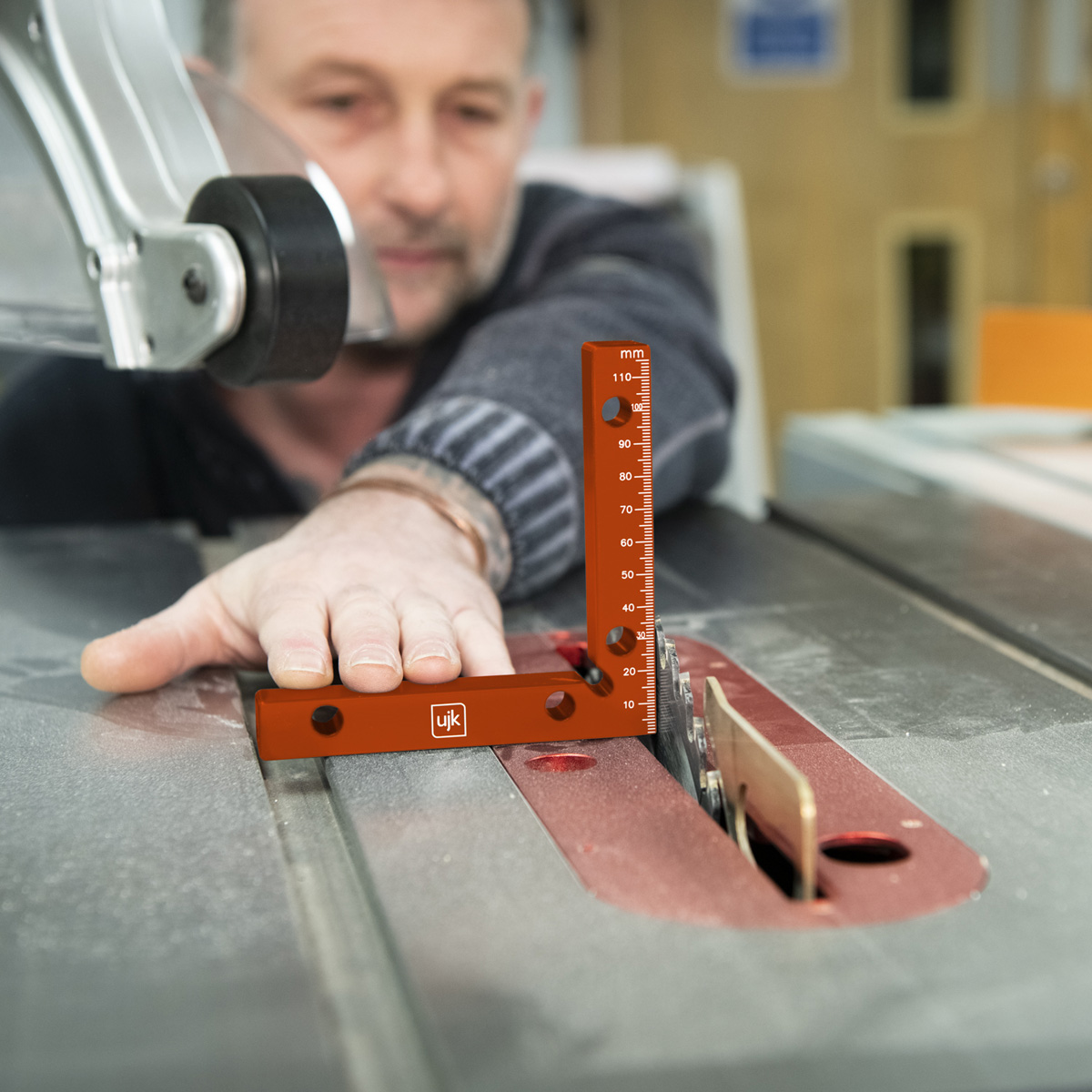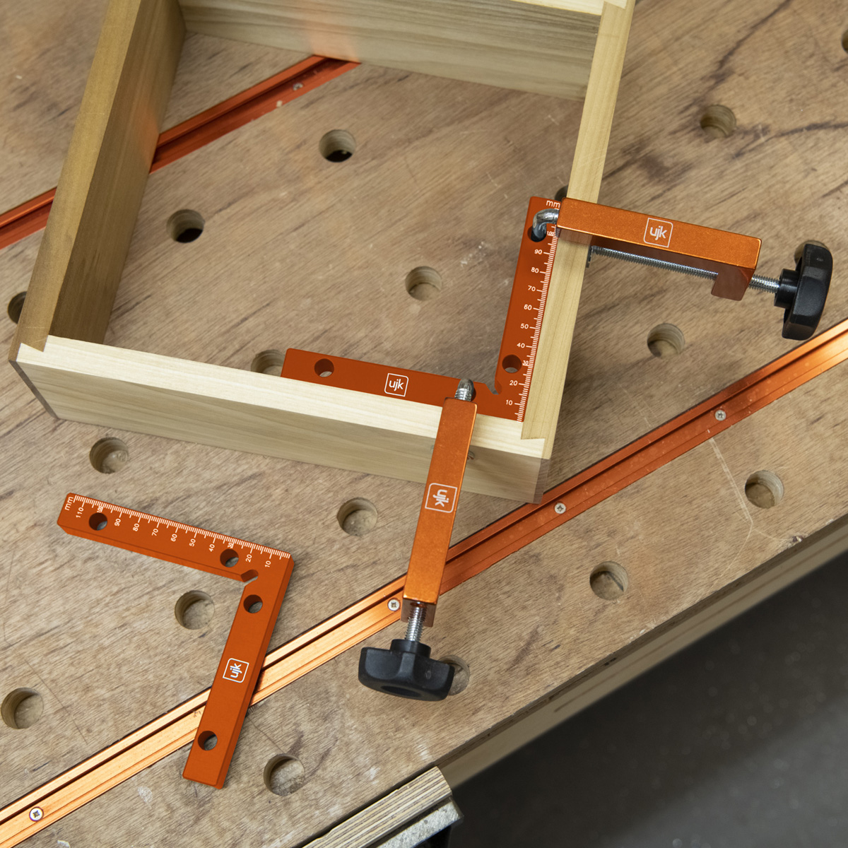 The UJK Assembly squares streamline your setup, ensuring saws, bandsaws, and fences are at precisely 90°. The graduated arm, marked in both metric and imperial, starts at the corner, doubling as a height gauge. Clamp them to secure drawer or box corners, on internal and external angles. The notched corner ensures full contact for accuracy, while the holes accommodate UJK Fence Clamps for a seamless clamping.