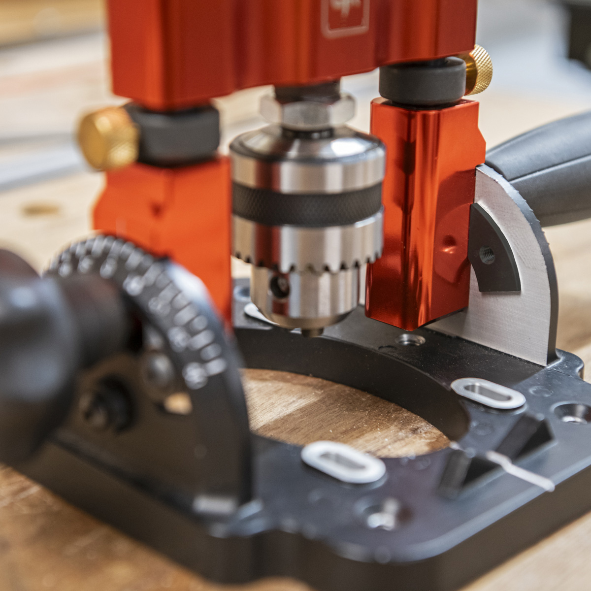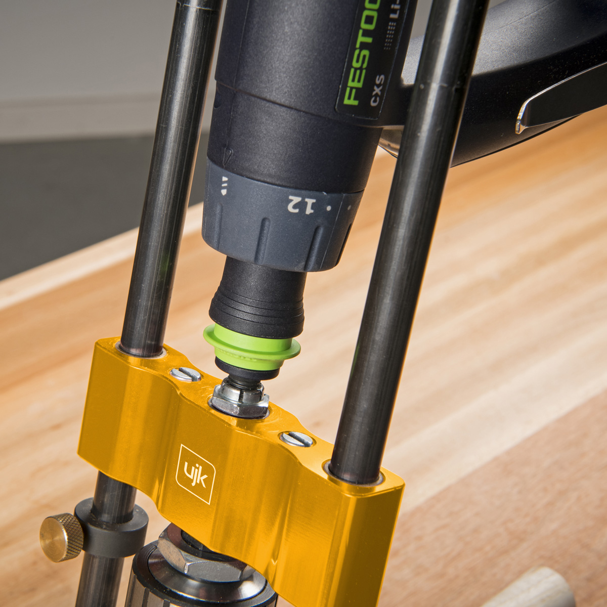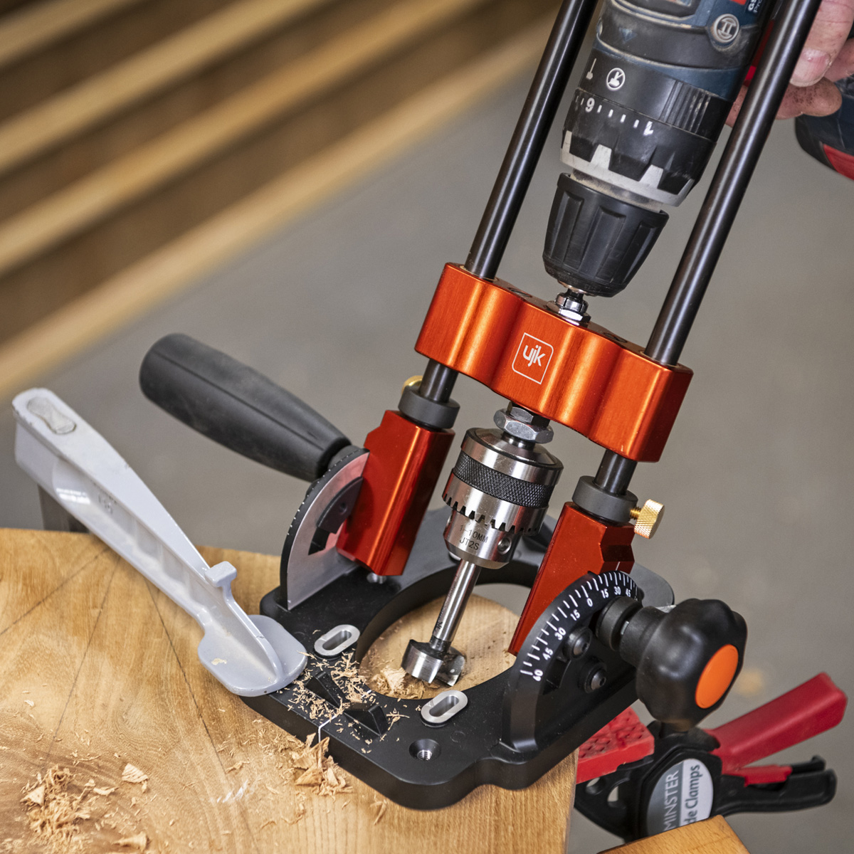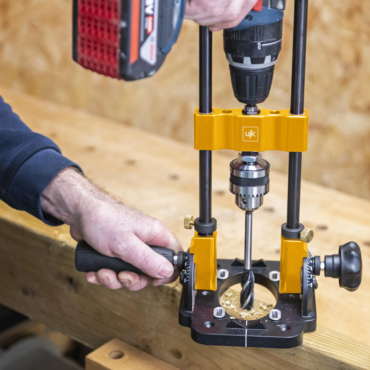With the UJK Drill Guide creates a compact, portable pillar drill. Using mains or cordless drill