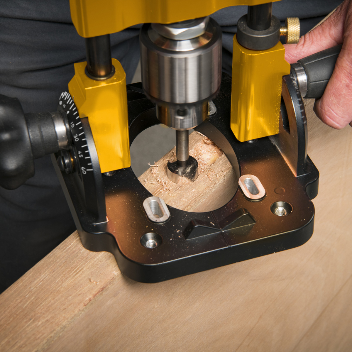 it can accurately drill holes at a wide range of angles, up to 110°. The guide allows you to clearly and easily, drill straight down or at an angle, locking it in place for stability. The guide bars and smooth bushings make sure the drill moves straight and smooth. The depth stop is great for making sure you don't drill too deep or not deep enough.