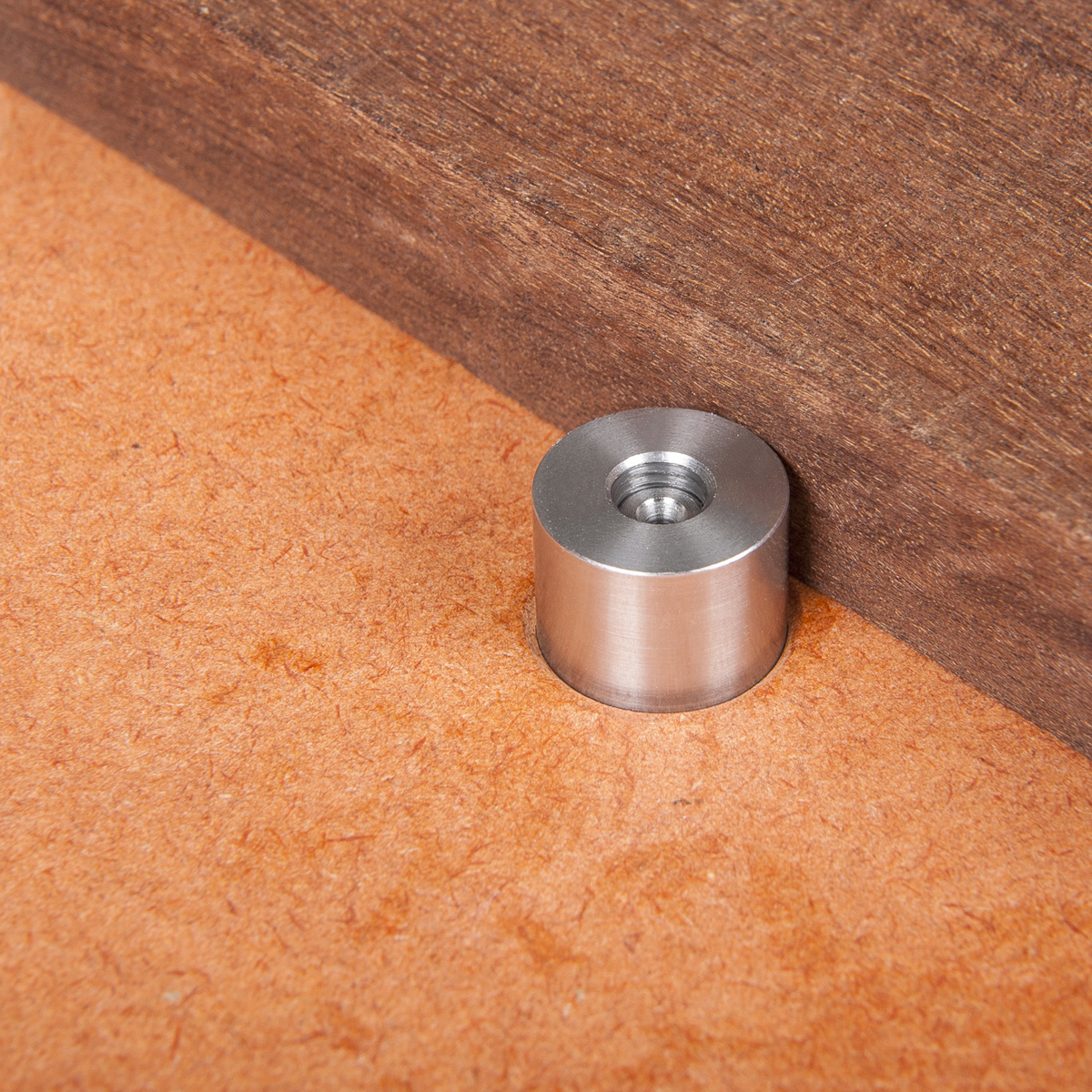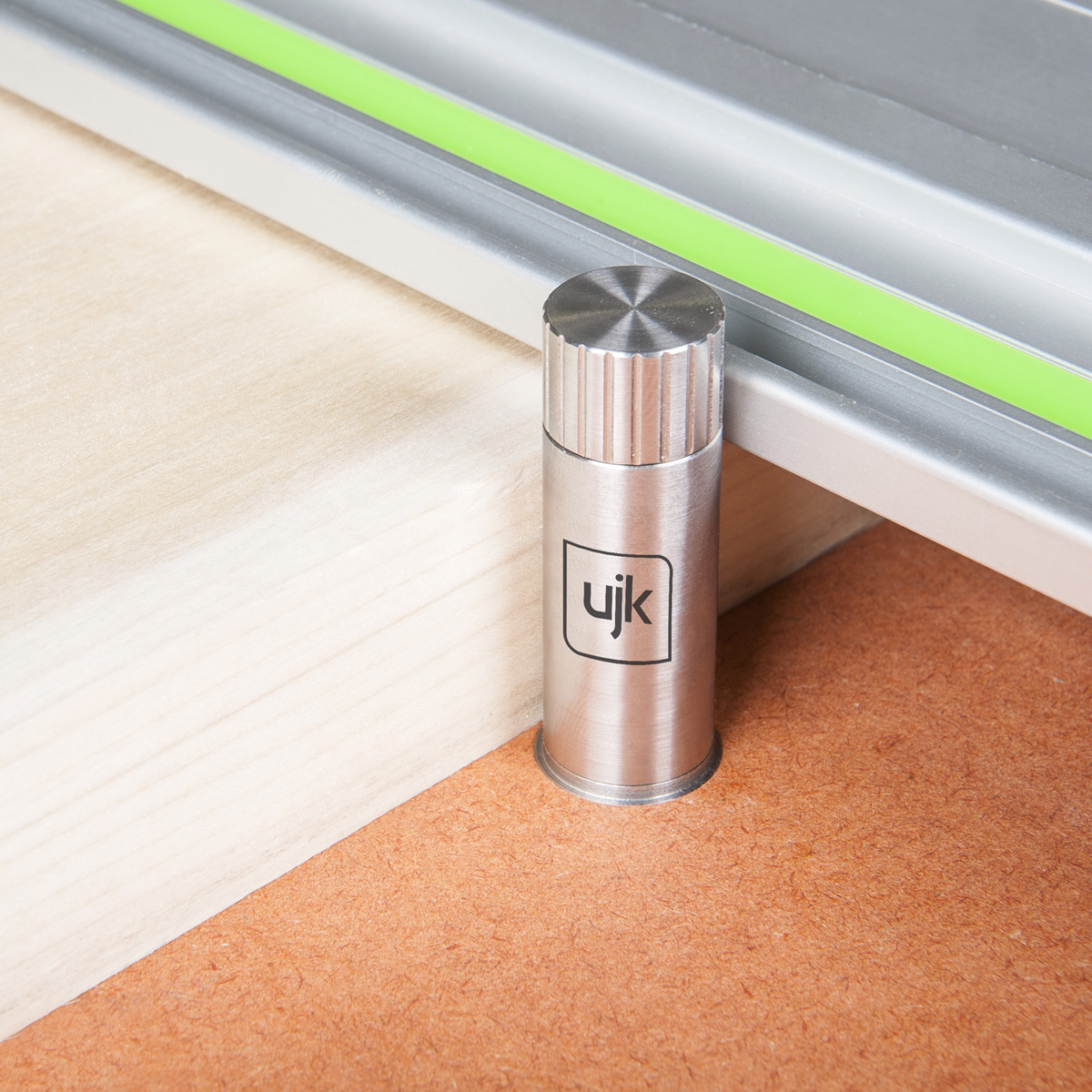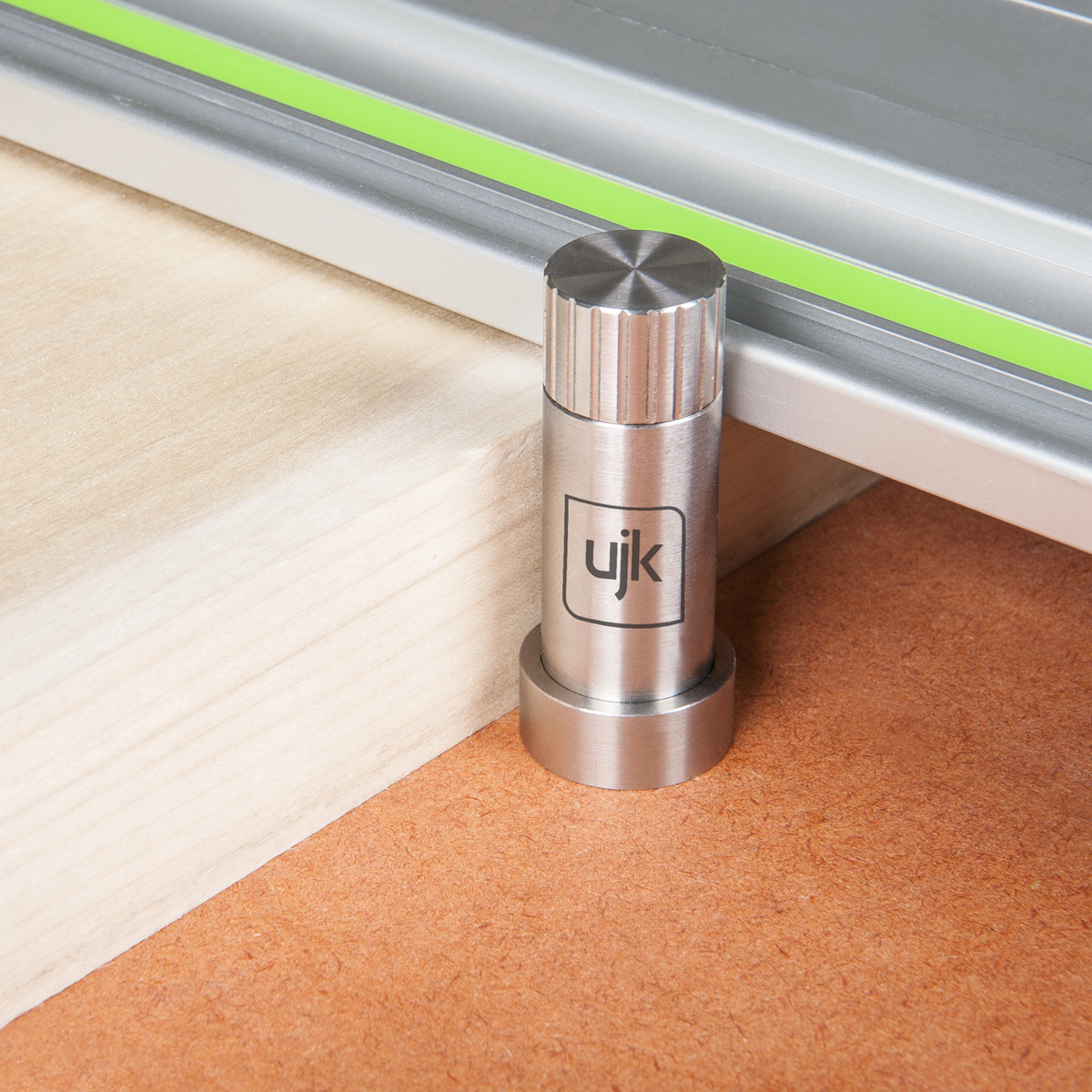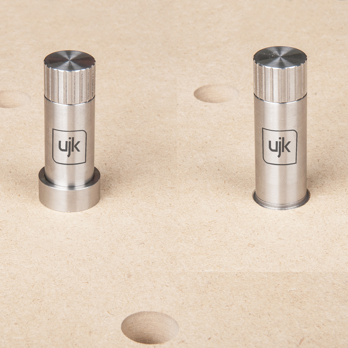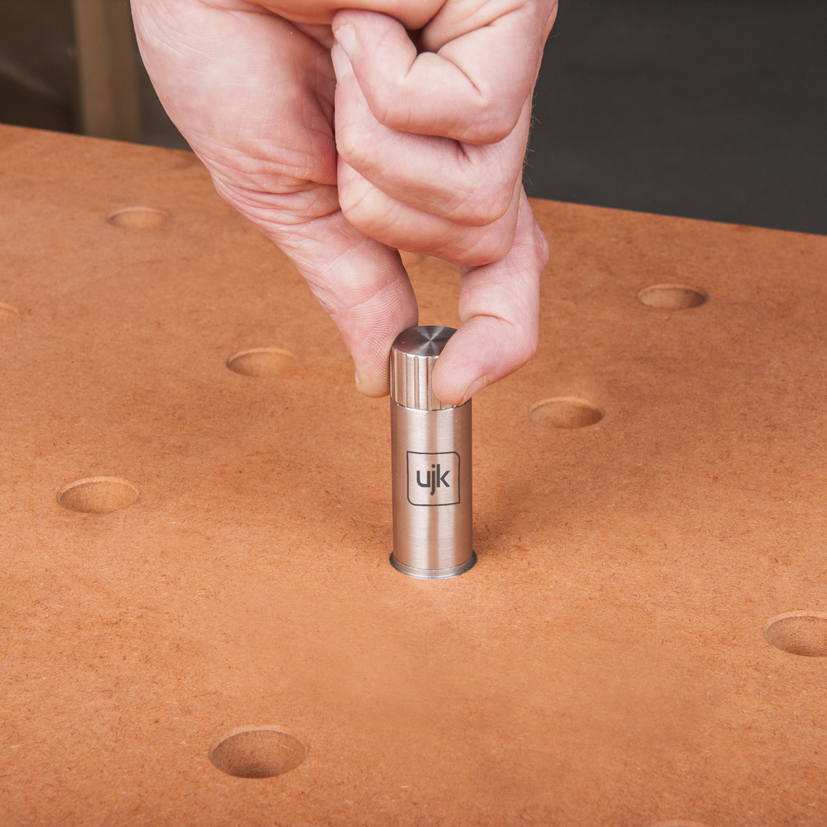 The UJK Super Dog, the ultimate bench accessory for woodworkers seeking precision and versatility. Designed to fit snugly into 20mm holes, this innovative tool is compatible with the UJK Technology Multifunction Workbench, Festool MFT/3, and other tables with 20mm holes. The stop collar ensures a precise 90° alignment of the dog to the UJK worktop, while maintaining a flush fit, by slotting into the chamfer around the dog hole.