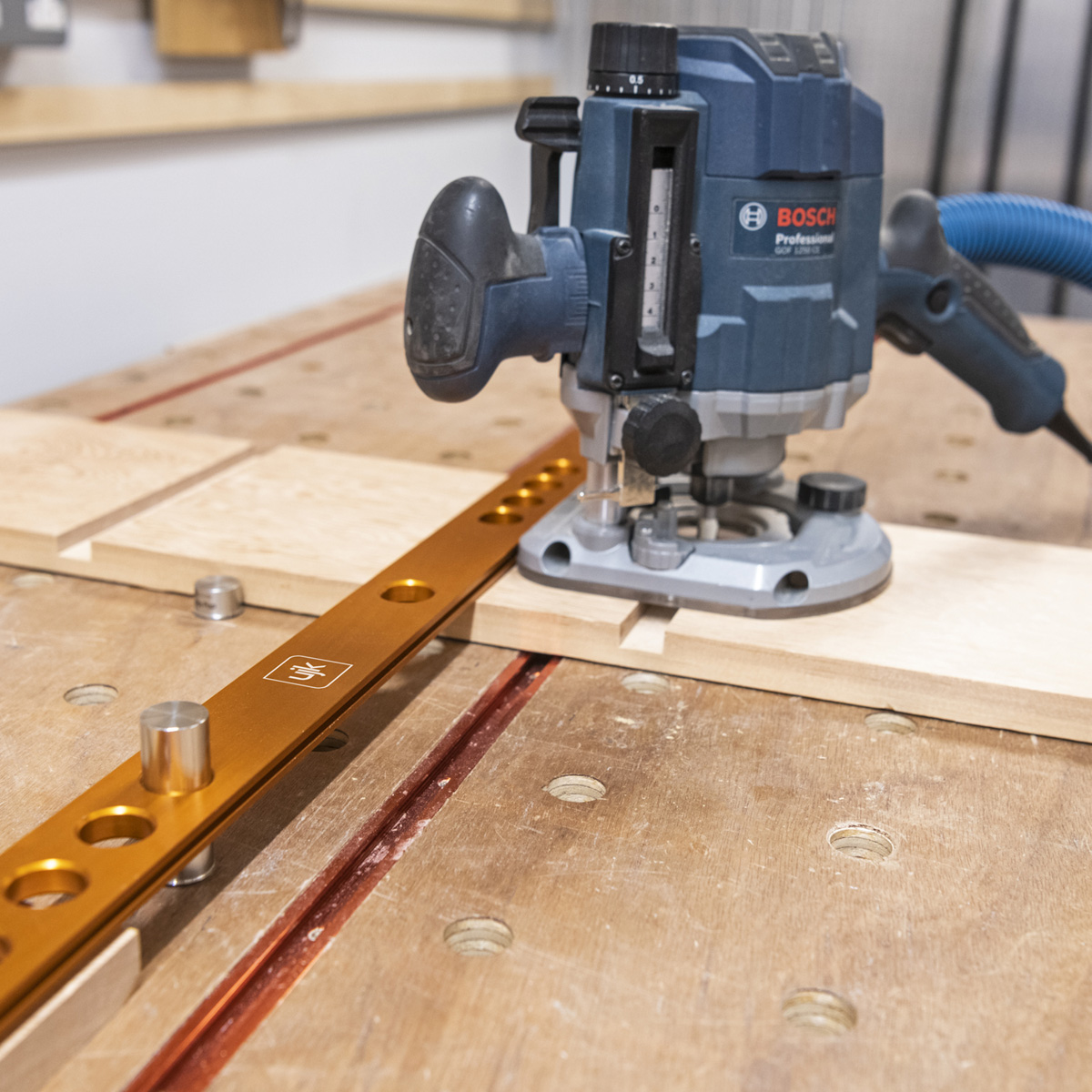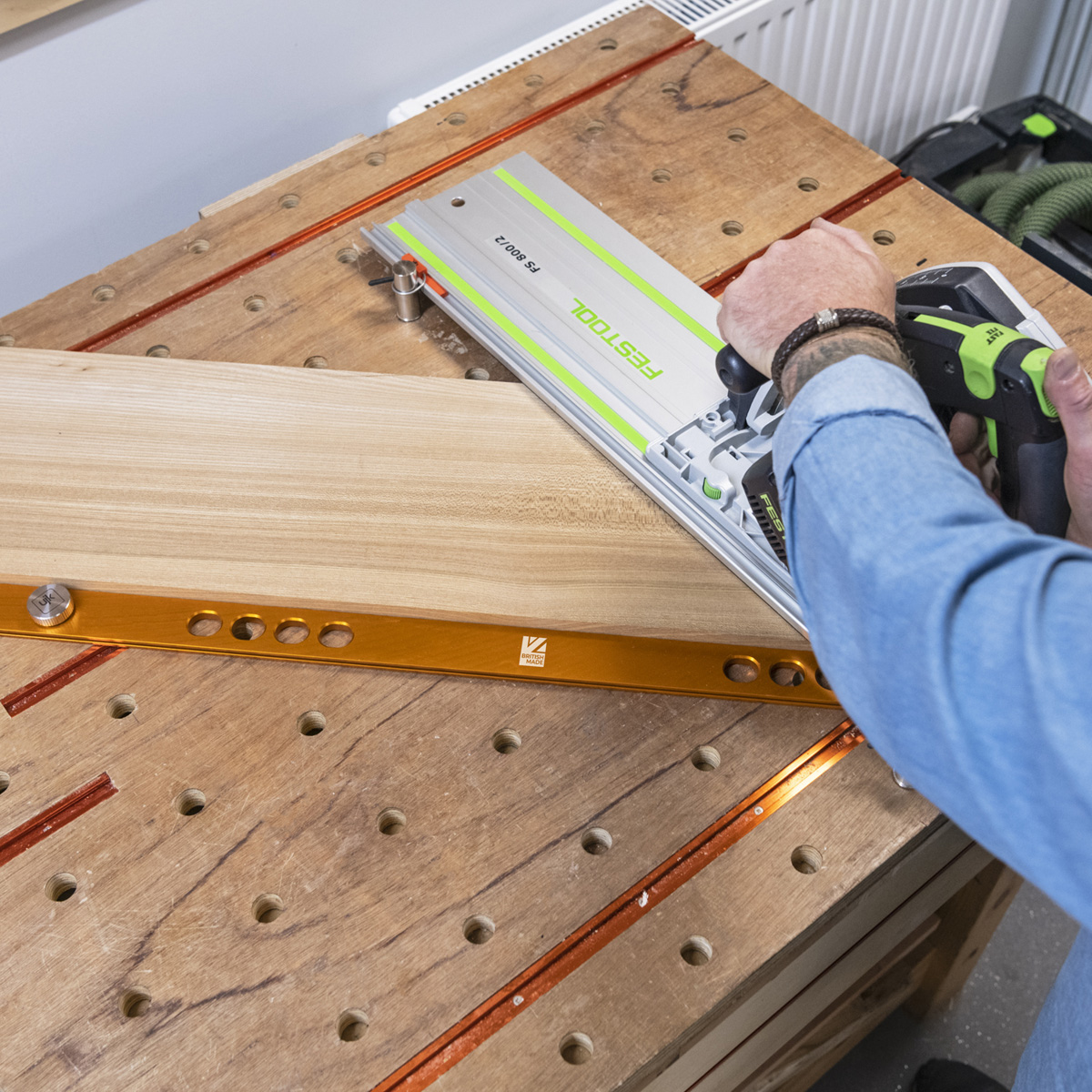 • The fence features dual sets of chamfered holes, 460mm apart and at 32mm centres, ensuring compatibility with System 32 for precise cabinet construction