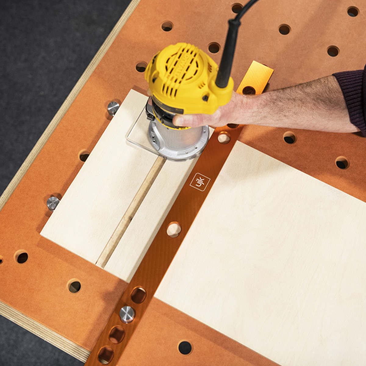 The UJK Parf System Fence & Stop Kit ensures a steady workbench setup, removing the need to adjust bench dogs for different cut lengths. The adjustable stop delivers consistent, precise cuts, moving the fence by one hole, or 32mm, allows for quick marking or drilling changes, increasing efficiency and precision. Using two fences at a 90° angle assists in assembling cabinet frames or drawers. The fence can also be placed on top of a workpiece and includes a hole for 45° angle settings.