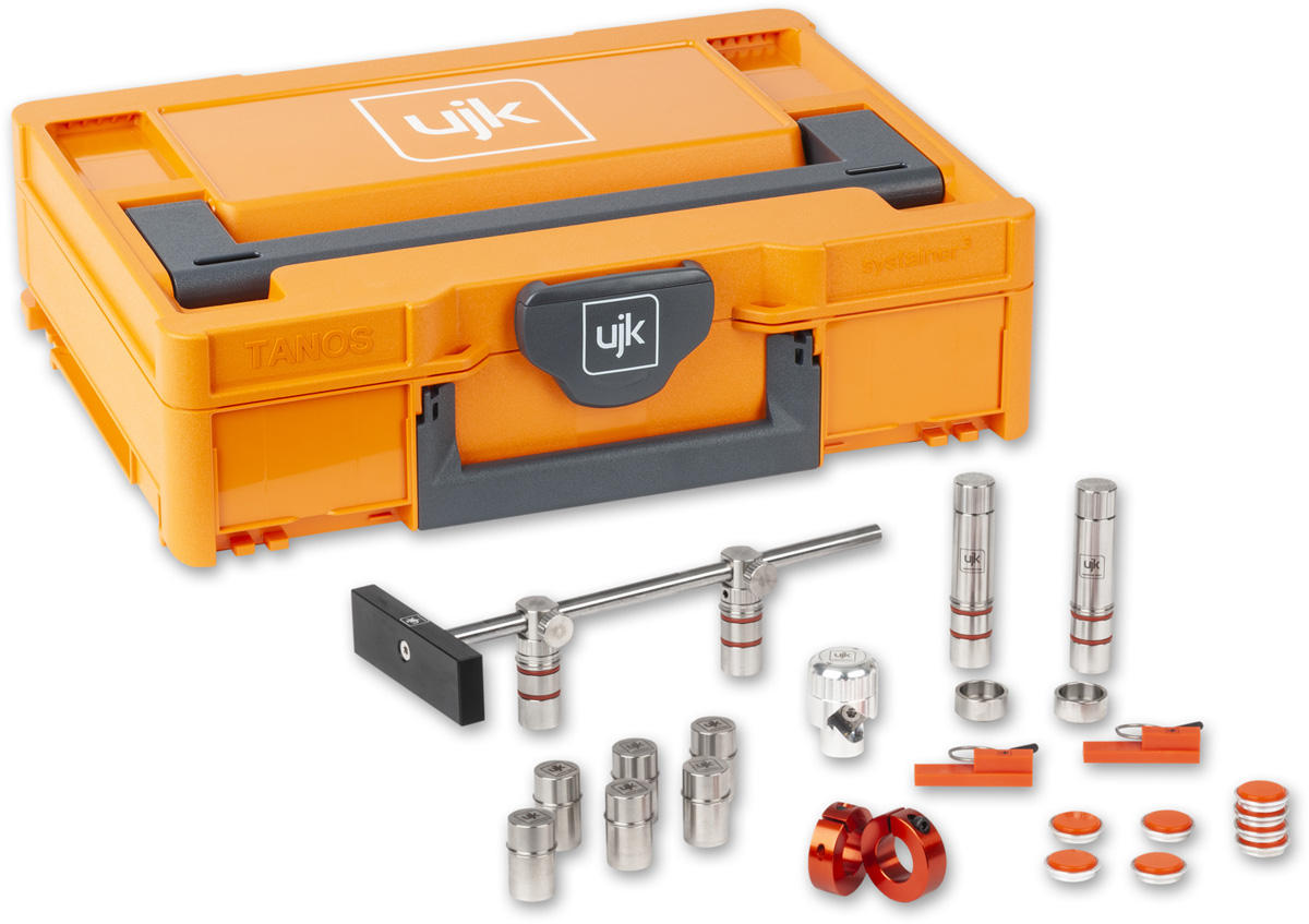 22 Essential Accessories: 2 x Super Dogs, 6 x Guide Pups, 2 x Dog Rail Clips, 1 x UJK Repeat Stop, 8 x UJK Worktop Anti Slip Protectors, 1 x Chamfer Tool and 2 x 20mm Dog Stop Collars