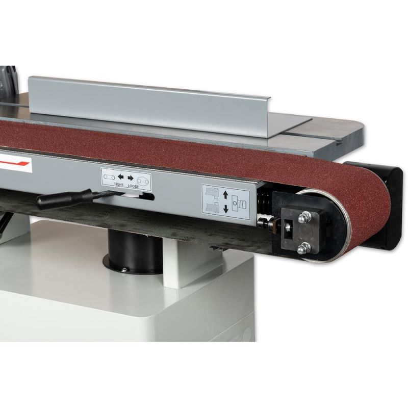 - This compact belt sander is a well made and relatively simple machine. With a 2.2kW motor driving a 150mm wide belt, it is one of the most useful machines to have in any woodworking workshop. The belt drive has an automatic oscillating action to provide a scratch-free finish and longer abrasive life. The belt also runs on a graphite anti-friction plate. The whole belt platen can tilt through 90° from vertical to horizontal, the precision ground cast iron table being easily adjusted in two planes to suit.