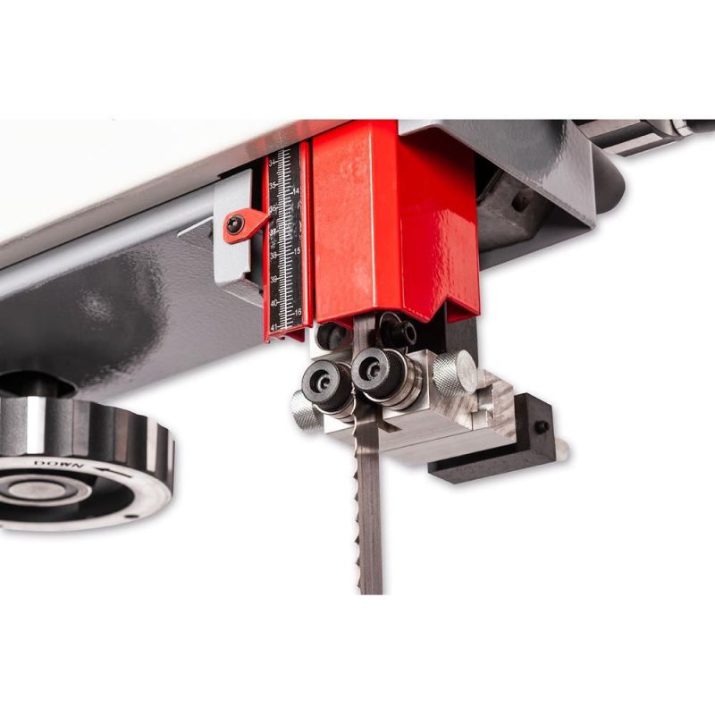 • Rack & pinion upper guide adjustment: Easily adjust the upper blade guide with the rack and pinion rise and fall. There is also a tension release lever for straightforward blade changes.