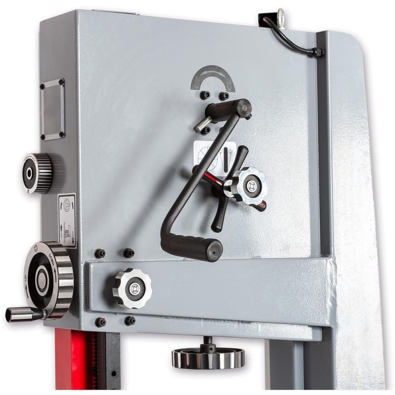 • Set up is a breeze; premium blade guides and a quick release blade tension lever make changing or adjusting your blades quick and easy. With levelling feet, you can get your bandsaw perfectly aligned in the workshop. Heavy duty metal handwheels mean your machine will remain in service longer.