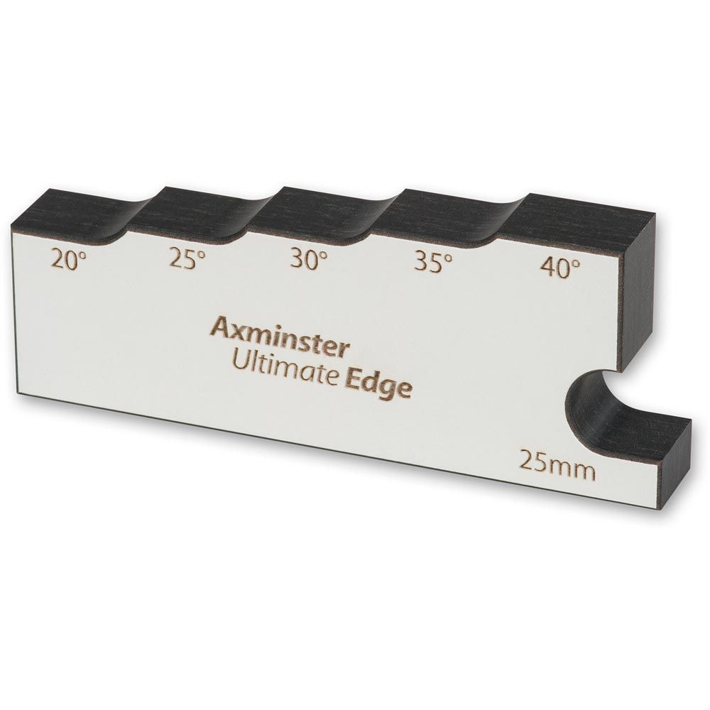 - This Angle Gauge for the Ultimate Edge Sharpening System guarantees rapid setup and precise bevel angles every time. It provides a quick and easy method of accurately setting the correct clearance between the machine’s platen and the bar that carries the honing guide. The gauge has five angle steps for bevels 20°. 25°, 30°, 35° and 40°. On the end of the gauge is a 25mm stop for setting the correct projection of a chisel or blade from the honing guide itself.