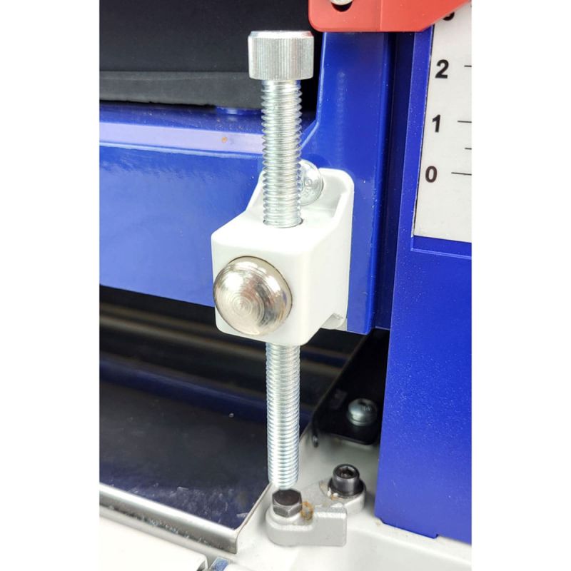 - The thicknessing height is quickly set using a large adjusting handle and reading from a scale, marked in both metric and imperial measurements. This setting can be physically secured using the cutting depth locking handle to ensure repeatability of the cutting depth. The timber is fed through the cutters by two rubber coated drive rollers. The cutter block rotates at 9000rpm leaving a smooth unmarked finish. A cut of up to 3mm deep can be made, when more than 3mm needs to be removed, simply use the quick action depth stop to ensure final dimension is not exceeded. Then make multiple passes to obtain the desired depth.