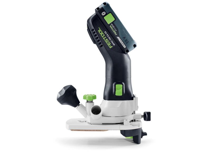 The cordless edge router for laminate. For perfect flush trimming or rounding off plastic and veneered edges. Its ideal centre of gravity means you can guide the router safely without it tipping over. The antistatic dust extraction whisks chips away upwards, so they don't pile up and mess with your routing results. Plus, the cordless drive with a brushless EC-TEC motor gives you even more flexibility.