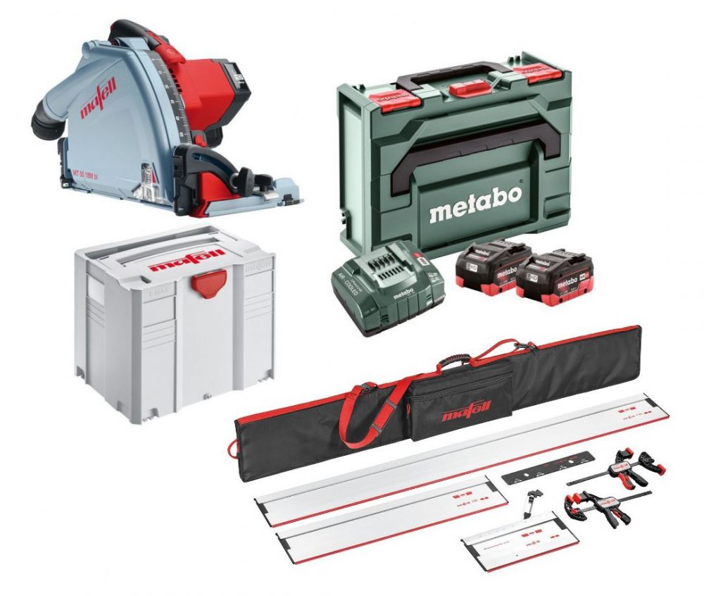 Mafell 91B402 MT 55 18 M BL Cordless Plunge Saw Package with Rails 209592 and Metabo 8ah