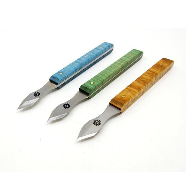 - Our anniversary drafting knives consist of solid stainless steel blades with finger cutouts and specially painted and polished wooden handles made of figured maple wood. The handles are firmly attached to the blade with brass rivets.