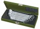 - Ratcheting function with 72-teeth inner gear ring, made of high alloy special steel allowing ratcheting even when the spanner can only be moved through 5°. With reverse lever for clockwise and anticlockwise rotation. Shaft of CrV steel with optimum surface protection: double nickel-plating and single matt-finished chrome-plating. With durable laser marking and easyto- read sizes. Total length 210mm.