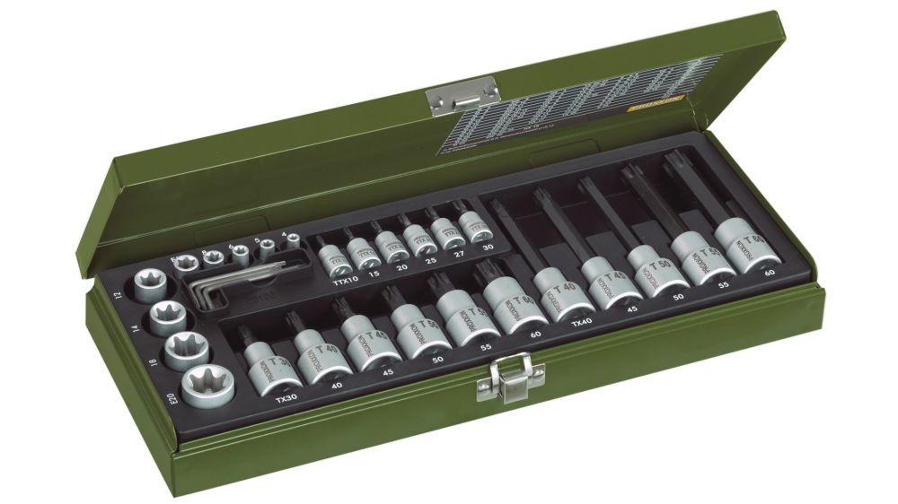 - 29-piece Specialty TX socket and TX socket bit set. In sturdy, powder coated steel case.