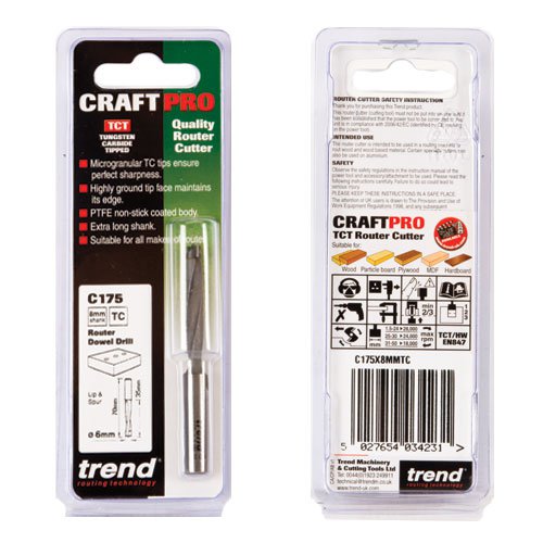 - Lip and spur dowel drills for use with the Trend Craft Dovetail Jig dowelling template.