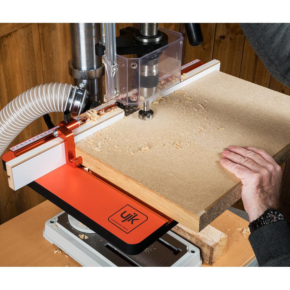 - Made from 26mm thick MDF it features an aluminium extrusion fence with sliding sub faces, a dust port for drum sanding extraction and a flip over length stop for repeat hole positioning.