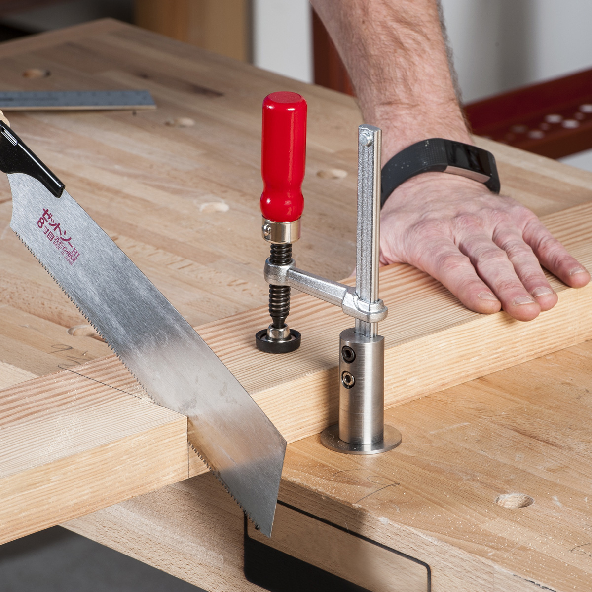 • The spigot on this fast acting ratchet hold down fits perfectly into any 20mm bench dog hole. The unique design makes it perfect for use with a UJK Multifunction workbench or the Festool MFT/3 Multifunction table. Additionally, you can use it on any UJK Parf Guide system cutting table. The maximum bench top thickness is 30mm. The hold down utilises the rapid action and controllable high clamping power of the Forged Quick Lever Clamp. It has a throat depth of 60mm and a maximum working height of 90mm. The spigot mount, locking knob and square support plates are S303 stainless steel CNC machined, highly accurate and rust free. The ratchet mechanism can generate exceptionally high clamping force; the support plates spread the load, preventing the spigot from deforming the dog hole. Dog holes and those in the Festool MFT/3 rely on their exact sizing to maintain accuracy, whenever feasible; it is advisable to the support plates. The top 4mm of the spigot is 25mm diameter, without a support plate this sits directly on top of you bench and precisely matches the 25mm portion of Bench dogs. It allows you to use the clamp’s spigot as a reference, positioning and clamping a workpiece at the same time. The ratchet mechanism gives you control over the amount of pressure applied without fear of damaging the dog hole. When positioning a workpiece on the vertical face of a UJK workbench. A Twist or Bench dog in one hole and this ratchet clamp directly above, means you will have the work set up in a matter of seconds.