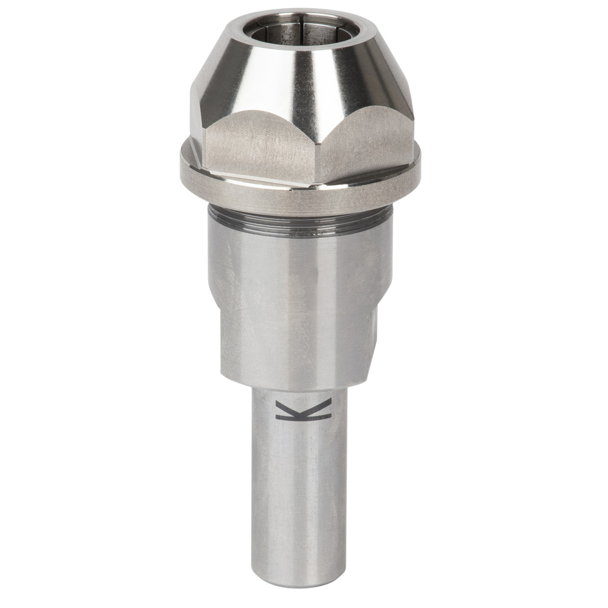- The UJK extension is supplied with a collet suitable for 1/2" shank cutters with collets available for 8mm, 1/4"(6.35mm) and 1/8"(3.2mm) shank sizes. A much improved grip all round the cutter shank is provided giving safer routing with less vibration, and the collet nut incorporates an ejection ring to release the shank for easy cutter changes. Maximum RPM of 18,000rpm. Dimensions are 75mm overall with body length of 40mm. N.B. Collet nut requires a 27mm spanner.