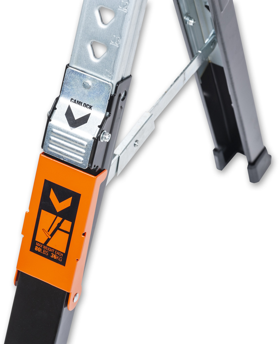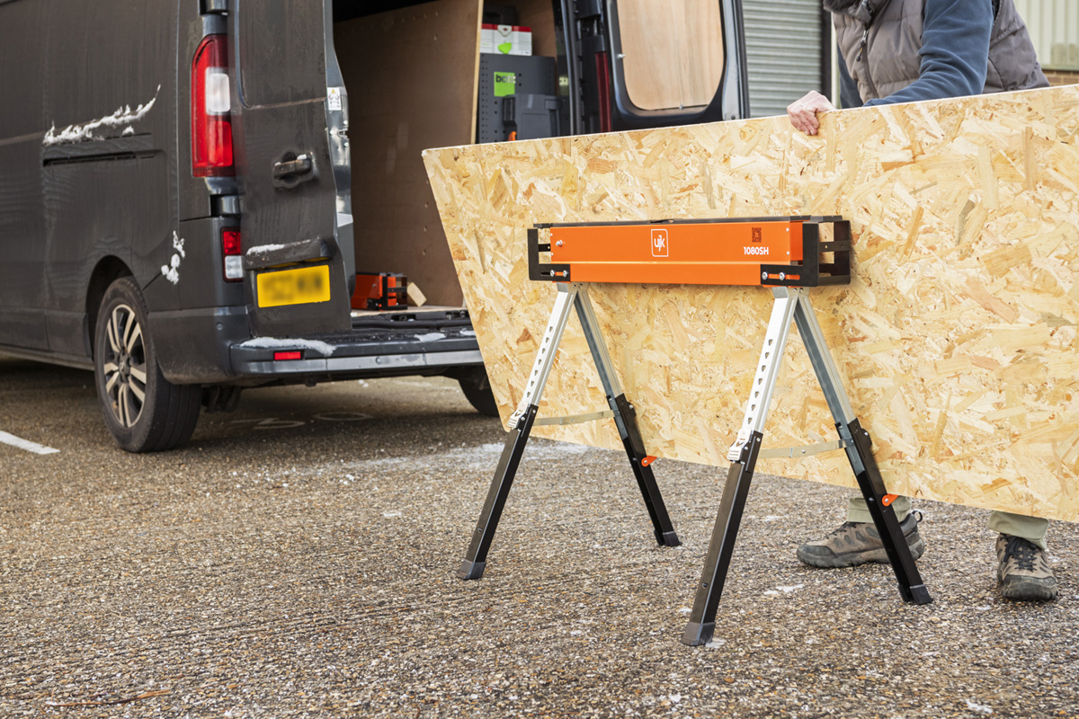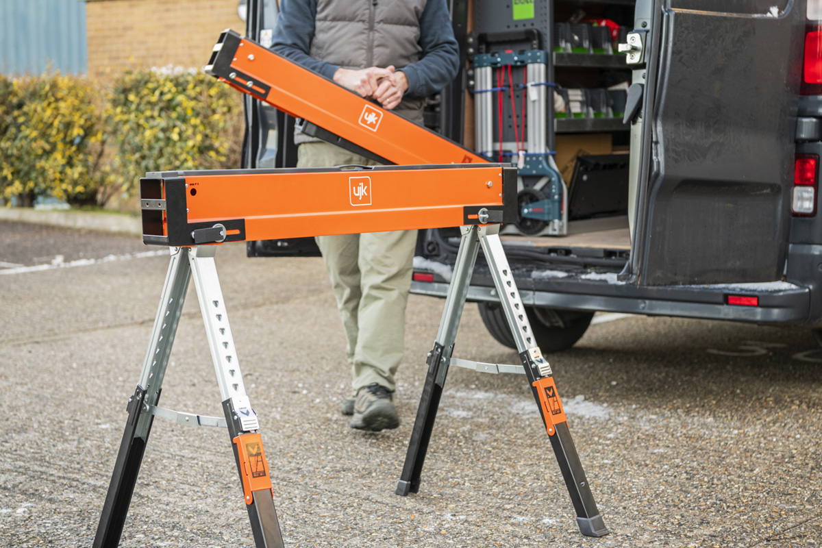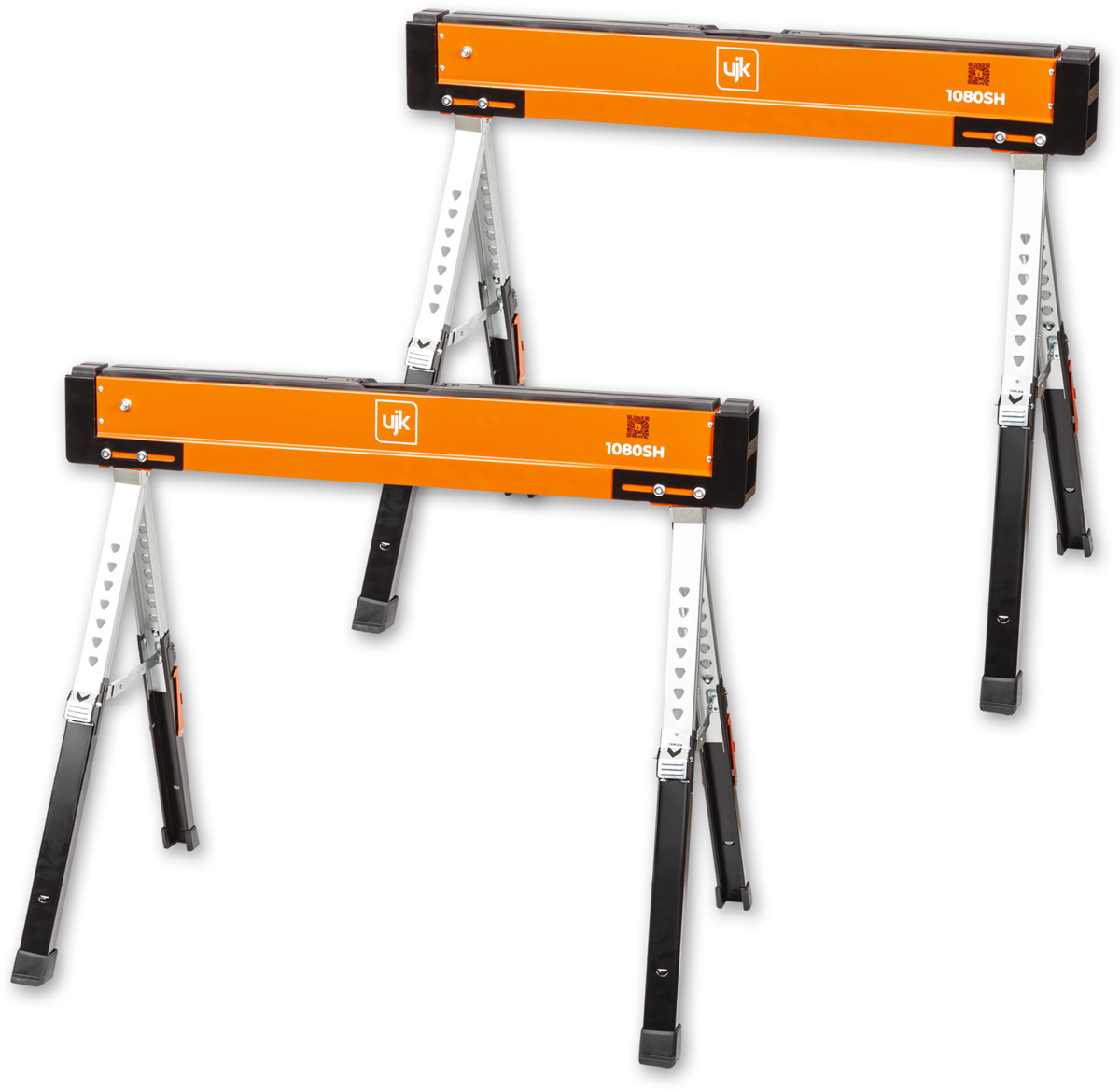 - The UJK Sawhorses, all-steel, folding saw horses, designed for convenience, versatility and durability. Compact and portable, they fit easily into your van or workshop. The legs fold neatly into the top rail and include carry handles for easy transport and storage. Featuring a quick-release button for easy setup, adjustable material support arms, hinged leg brackets, a reinforced top, and telescopic legs for customizable height. With rubber feet for stability and corrosion-resistant coating, each saw horse supports up to 590kg, making them perfect for creating a solid workbench on-site.