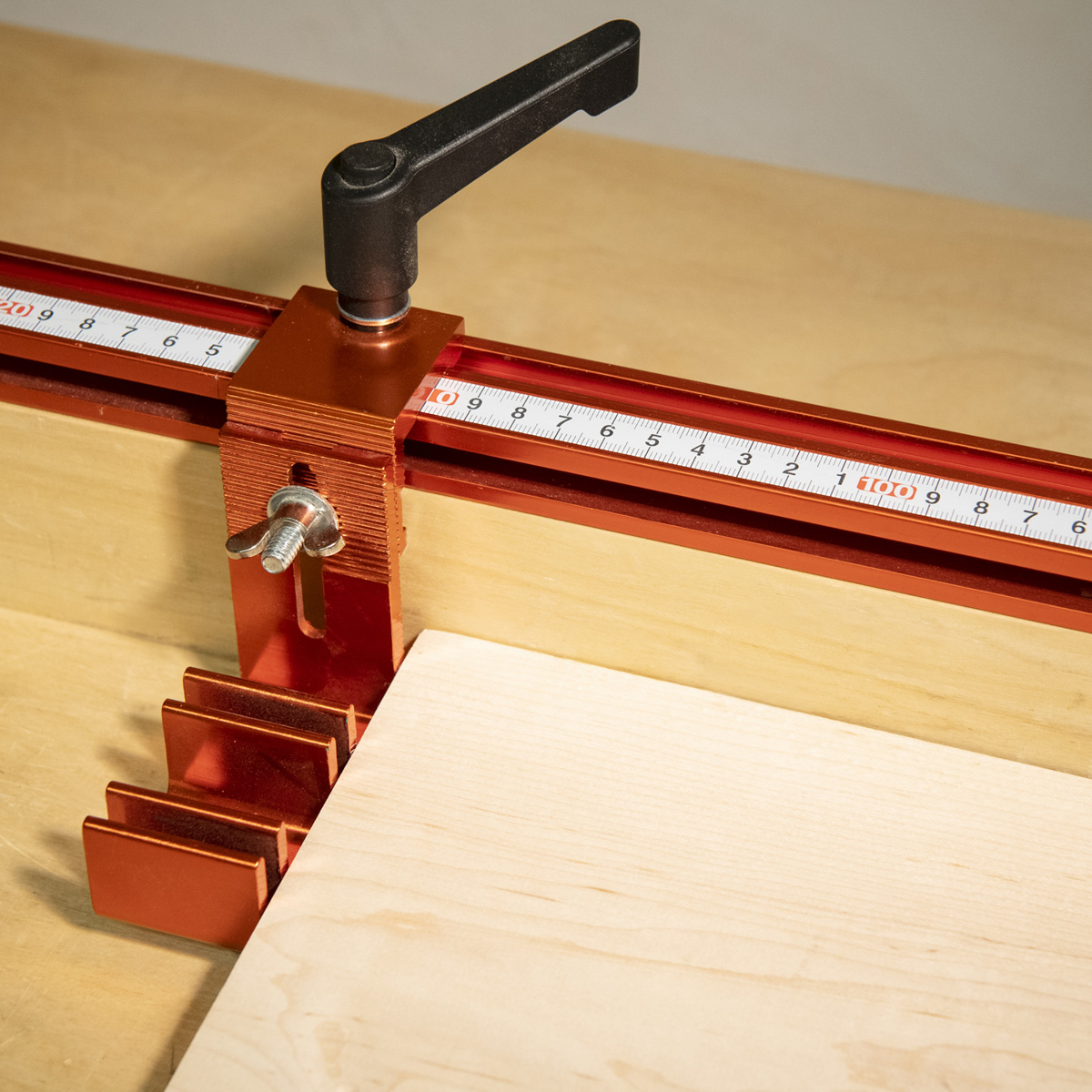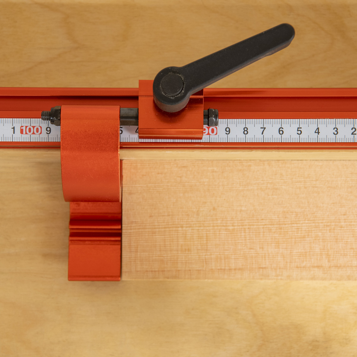 - Extra lengths of track are available should you wish to make a longer fence. The self-adhesive scales sit in a shallow groove on the top of the track. Both 3m long and graduated, one reads left to right, the other right to left. The cut length stops run in the top T-slot. The flip-over is for small runs and the production stop for longer runs.