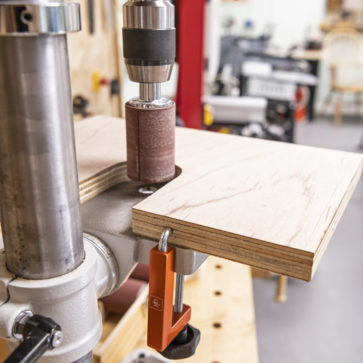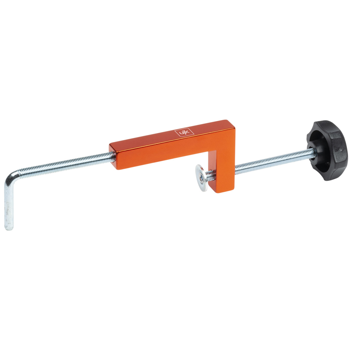 - Secure your sub fence with the UJK Universal Fence Clamps. These clever clamps allow you to attach a wooden sub-fence securely, leaving the face obstruction-free, ready for cutting. Simply drill an 8.5mm hole in the fence, and the clamps will hold the sub-fence in place. The 16mm square section anodised aluminium body and 7mm round steel bar ensures durability. The clamping screw is 80mm long. This gives the clamp a maximum capacity of just over 150mm, with a throat depth of 38mm.