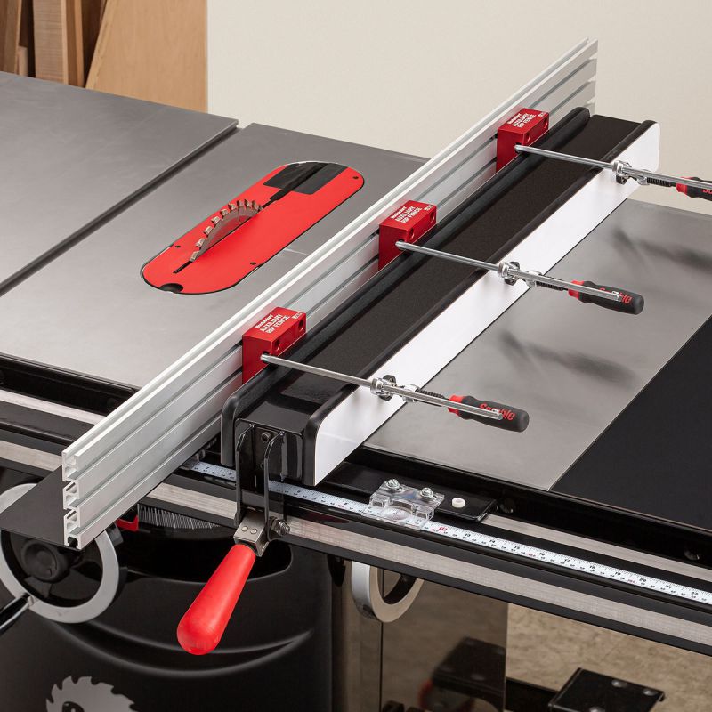 - Woodpeckers new Auxiliary Rip Fence adds precision, safety, and versatility to your standard table saw rip fence, no matter whether it's brand new or 60 years old. The heavily ribbed extruded aluminum fence is straighter, longer and taller than your standard rip fence. The plywood fence faces found on most modern rip fences are subject to movement from temperature and humidity changes. Even inconsistent pressure on the mounting screws can warp and twist the face. By simply clamping on the Auxiliary Rip Fence, you have a straighter reference for the edge of your material. Plus, the extra length and the included material support hold your workpiece up on either the infeed or outfeed side of the blade… now you can focus on the cut rather than balancing your board. The Auxiliary Rip Fence is secured to your standard fence using precisionmachined aluminum clamping blocks and normal track clamps. The combination of the clamping blocks and the fence is precisely 2", which means your fence scale is still usable. Just add 2" to your desired dimension and set your fence. The 7 T-tracks in the fence allow you to reconfigure it in countless ways and easily add featherboards, stops and jigs. Give your table saw fence the face lift it deserves with Woodpeckers new Auxiliary Rip Fence.