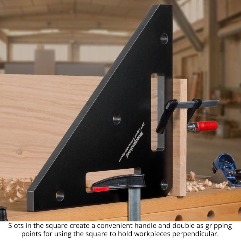- Great for Assembly Work, Too. Slots are milled into the phenolic along both edges. This lets you clamp the square to your MFT (or any workbench, for that matter) and then your workpiece to the square. Now your work is perpendicular to the work surface. You can also clamp the square to two joining workpieces, holding them perpendicular to each other. If you use it to square up your work during assembly, don’t worry if you get a little too generous with the glue…in won’t stick to the square.