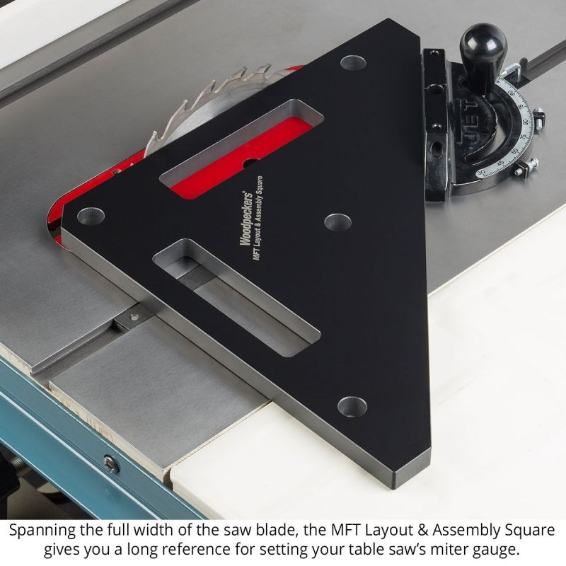 - Woodpeckers MFT Layout & Assembly Square makes quick work of the often-tedious task of aligning your track saw guide rail with the fence of your Festool Multi-Function Table. At 3/4" thick, this solid phenolic square can rest flat on the table and intersect with both the fence and the rail at the same time. No more trying to hold a framing square along the guide rail and hoping you’ve got it aligned. If that was this tool’s only trick, it would be a great addition your shop, but there’s more.